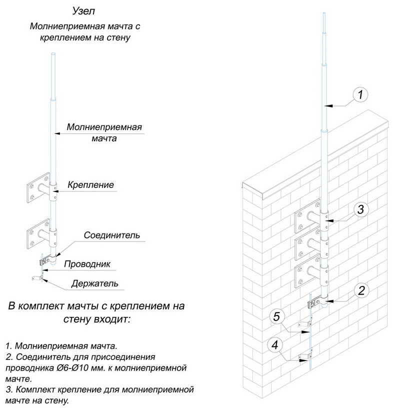 В комплект молниеприемной мачты входит: молниеприемник, комплект для установки молниеприемной мачтв на стену, соединитель молниеприемной мачты и круглого проводника Ø6-Ø12 мм.
