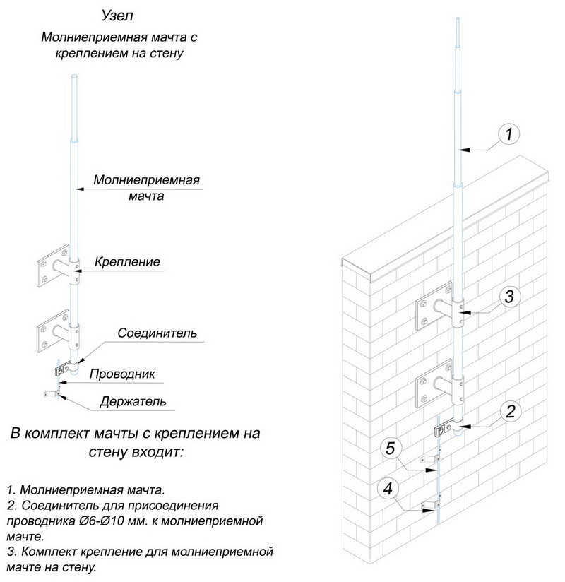 В комплект молниеприемной мачты входит: молниеприемник, комплект для установки молниеприемной мачтв на стену, соединитель молниеприемной мачты и круглого проводника Ø6-Ø12 мм.