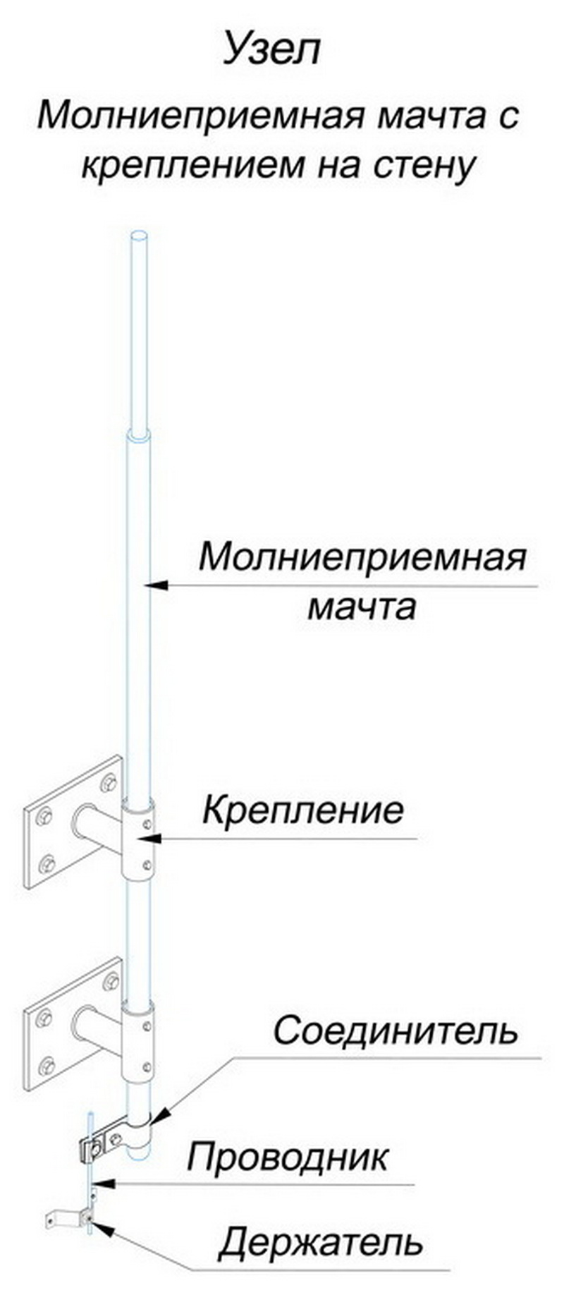 Молниеприёмную мачту можно установить на стене и дымоходе. Проводник крепится к молниеприёмной мачте при помощи болтового соединителя.