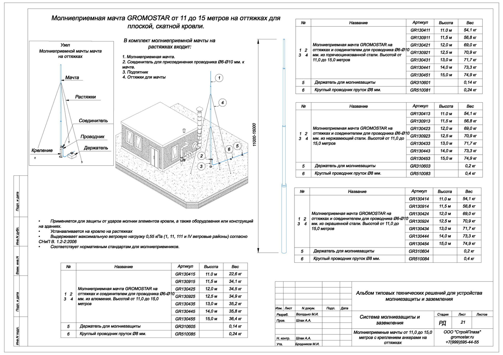 Молниеприемная мачта на анкерах и оттяжках 15 метров Громостар предназначен для молниезащиты зданий, сооружений, элементов крыши, и т.д., которые согласно технике безопасности, должны быть защищены от попадания молнии.