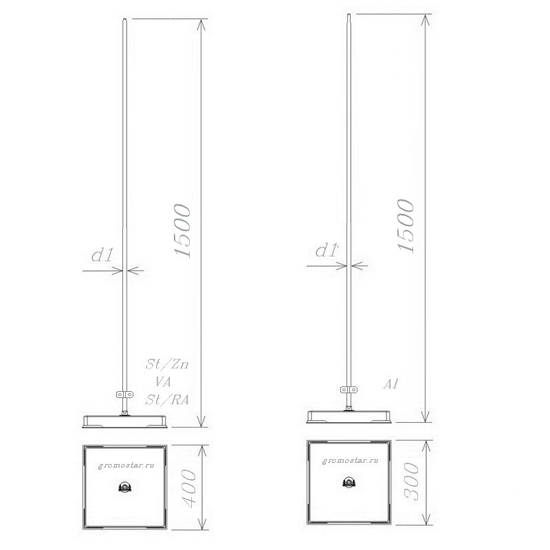 Подробности касающиеся способа установки молниеприемника найдете на сайте. Молниеприемник выпускается из оцинкованной сталь St/Zn, нержавеющей стали VA и алюминия Al.