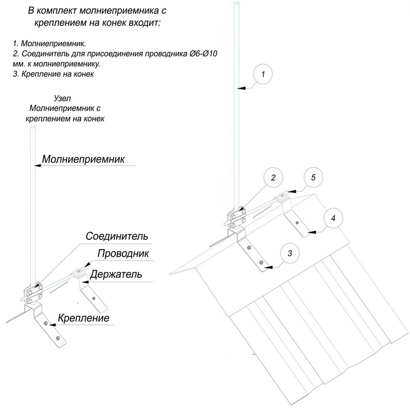 В комплект молниеприёмника входит: стержневой молниеприёмник, комплект для установки молниеприёмника на конёк, соединитель молниеприёмника и круглого проводника.
