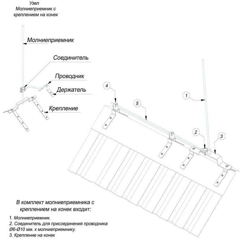 В комплект молниеприёмника входит: стержневой молниеприёмник, комплект для установки молниеприёмника на конёк, соединитель молниеприёмника и круглого проводника.