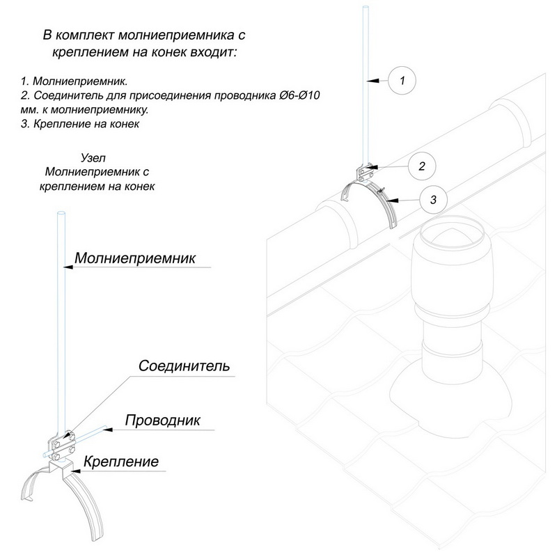 В комплект молниеприёмника входит: стержневой молниеприёмник, комплект для установки молниеприёмника на конёк, соединитель молниеприёмника и круглого проводника Ø6-Ø12 мм.