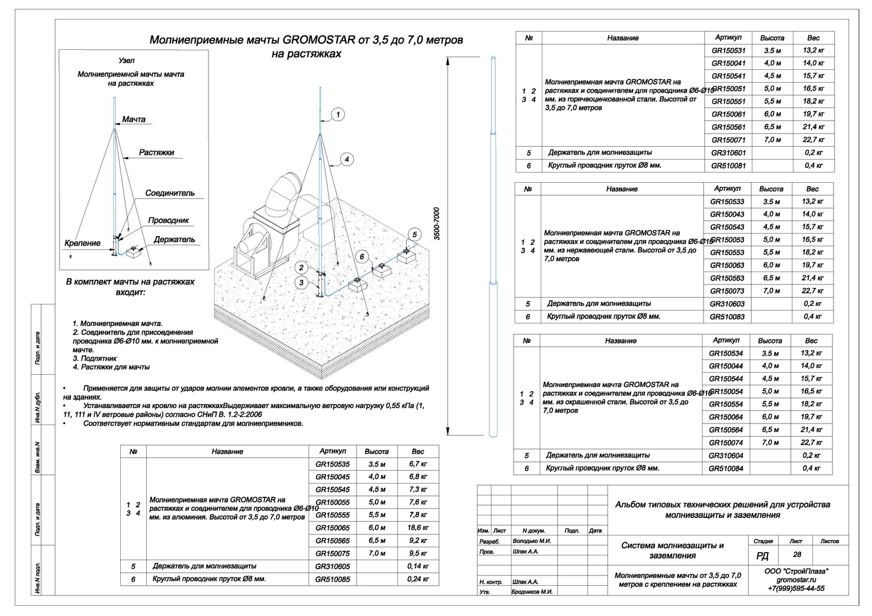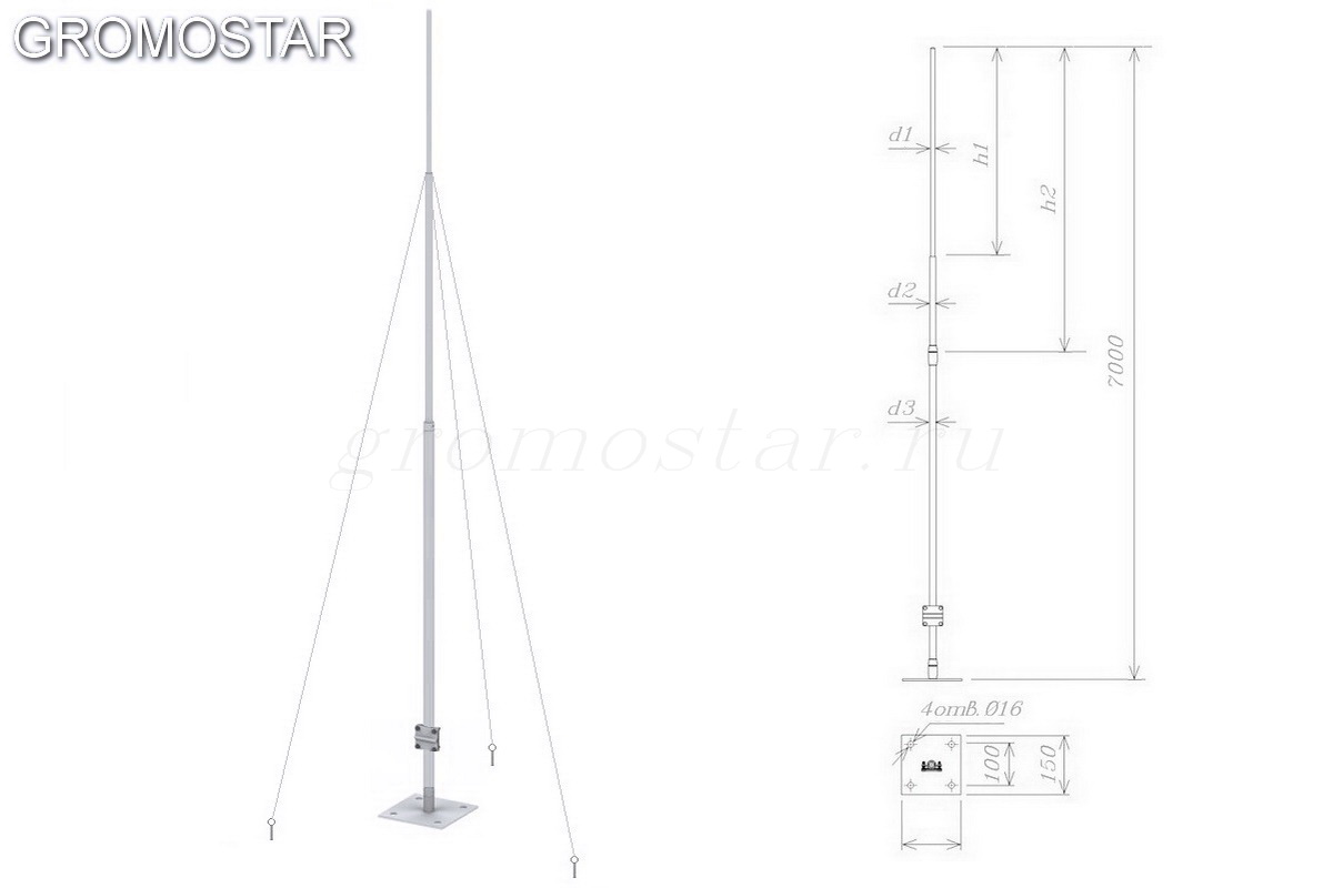 Молниеприемная мачта на растяжках 7 метров Громостар предназначен для молниезащиты зданий, сооружений, элементов крыши, и т.д., которые согласно технике безопасности, должны быть защищены от попадания молнии.