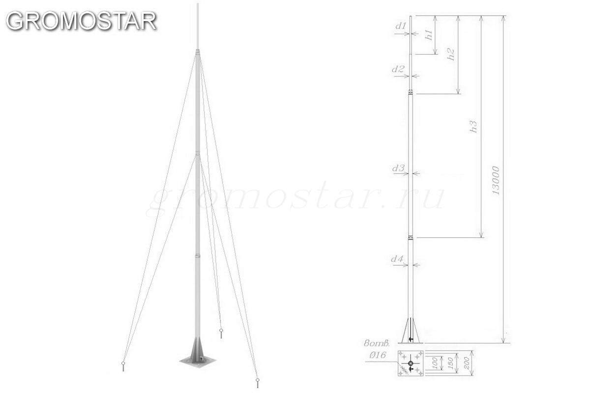 Молниеприемная мачта на растяжках 13 метров Громостар предназначен для молниезащиты зданий, сооружений, элементов крыши, и т.д., которые согласно технике безопасности, должны быть защищены от попадания молнии.