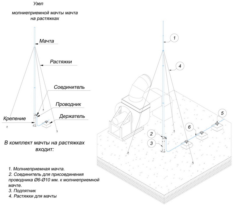 Молниеприемная мачта на растяжках с откидным механизмом имеет в составе: молниеприёмная мачта с закладной деталью, соединитель для присоединения мачты к проводнику, комплект растяжек. Молниеприёмная мачта устанавливается на бетонную плоскую кровлю и закрепляется анкерными болтами и оттяжками.