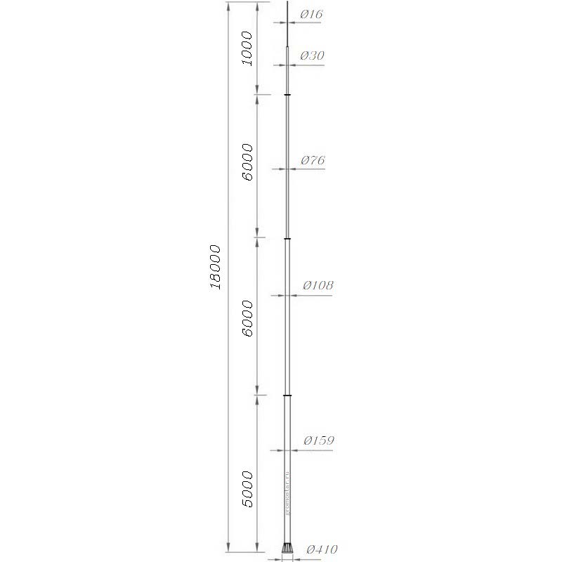 Отдельно стоящий молниеотвод высотой 18 метров с закладной деталью имеет в составе: мачта с закладной деталью, соединитель для присоединения мачты к проводнику. Молниеотвод устанавливается на грунт.