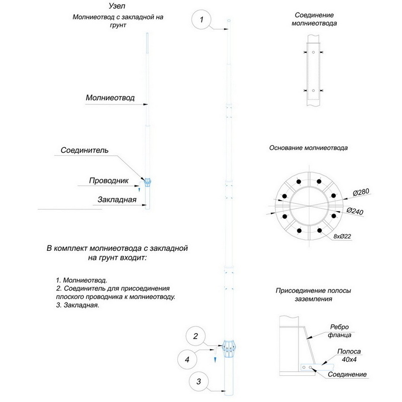 В комплект молниеотвод входит: мачта, закладная для установки, соединитель мачты и проводника.