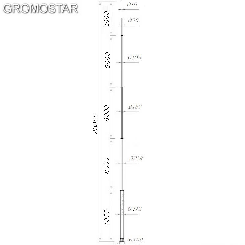 Отдельно стоящий молниеотвод высотой 23 метра с закладной деталью Громостар предназначен для молниезащиты зданий, сооружений, элементов крыши, и т.д., которые согласно технике безопасности, должны быть защищены от попадания молнии.