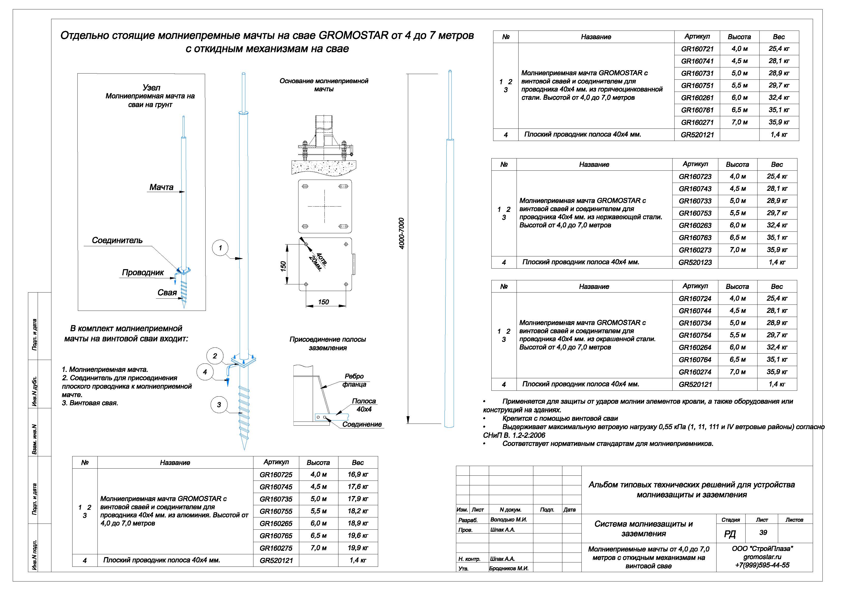 Отдельно стоящая молниеприемная мачта 6 метров GROMOSTAR с откидным механизмам для ручной установки на свае имеет в составе: мачта, свая, соединитель для присоединения мачты к проводнику. Молниеприемная мачта устанавливается на грунт.