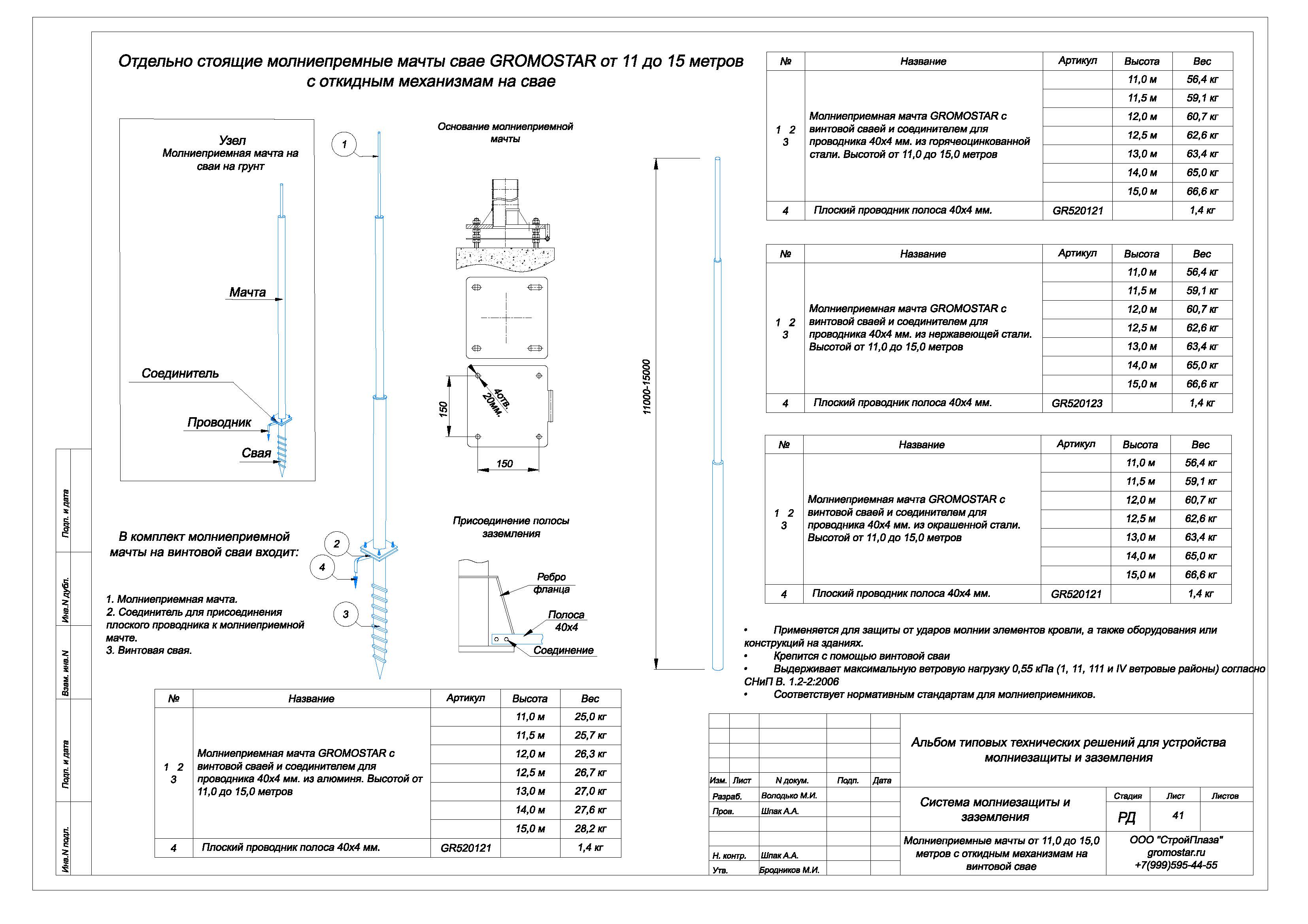 Отдельно стоящая молниеприемная мачта 13 метров GROMOSTAR с откидным механизмам для ручной установки на свае имеет в составе: мачта, свая, соединитель для присоединения мачты к проводнику. Молниеприемная мачта устанавливается на грунт.