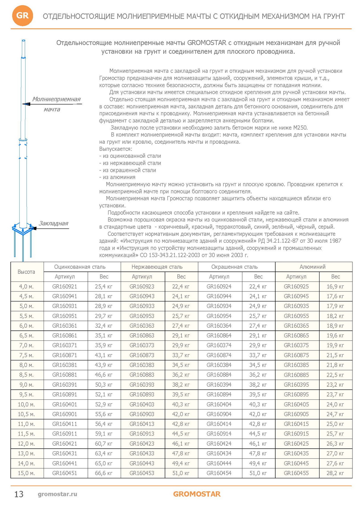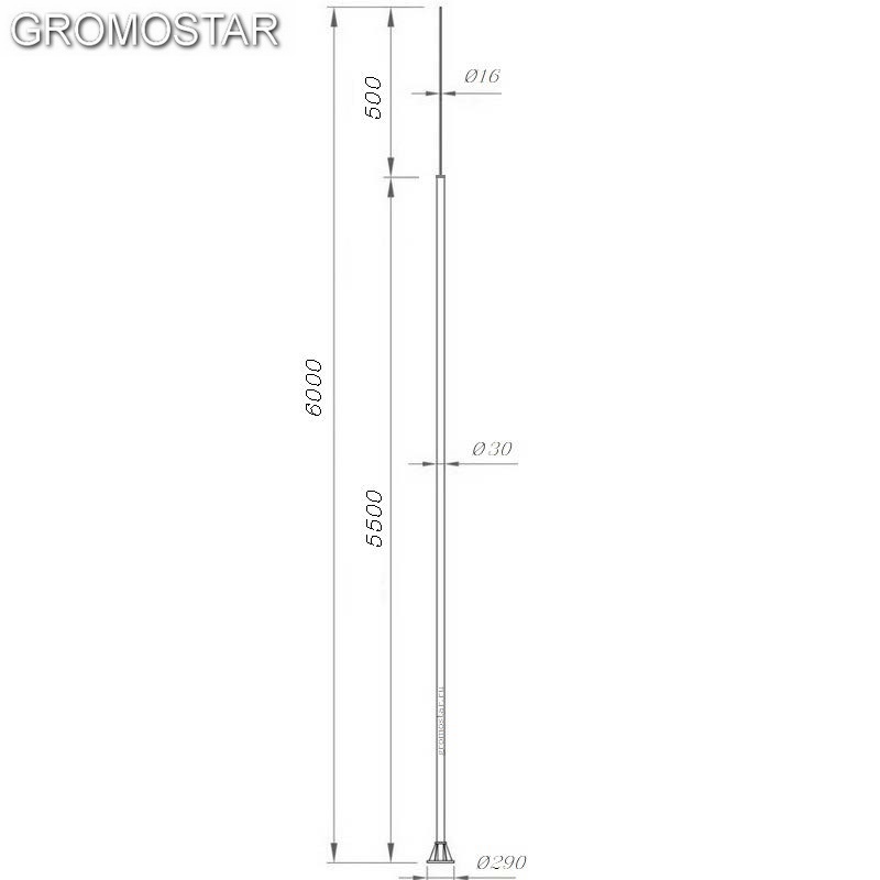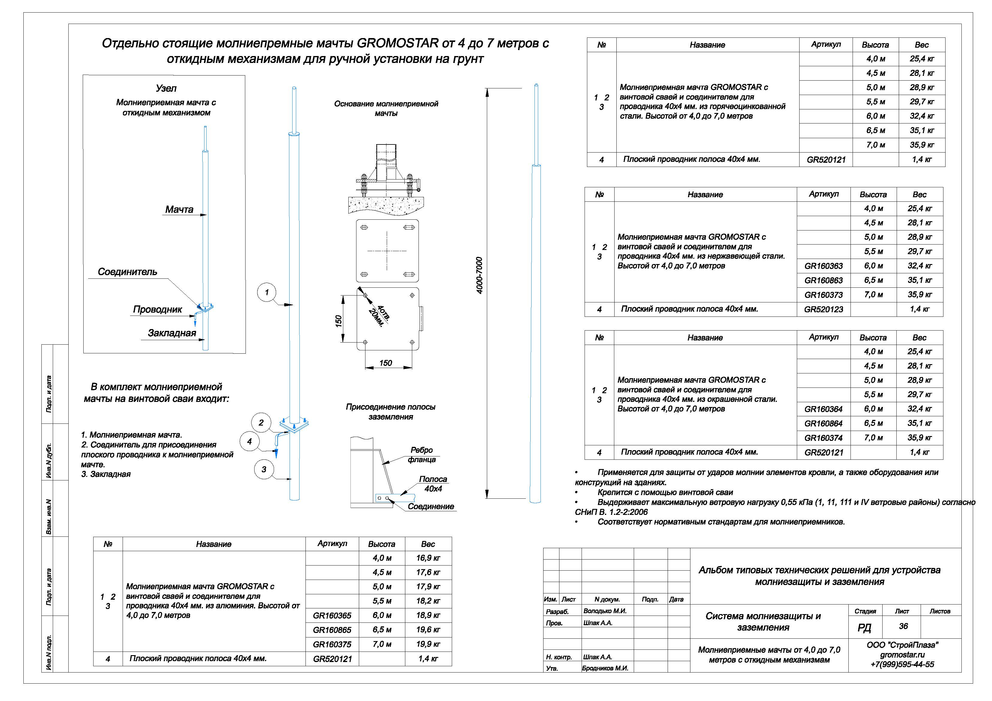 Отдельно стоящая молниеприемная мачта 6 метров GROMOSTAR с откидным механизмам для ручной установки имеет в составе: мачта, закладная, соединитель для присоединения мачты к проводнику. Молниеприемная мачта устанавливается на грунт.