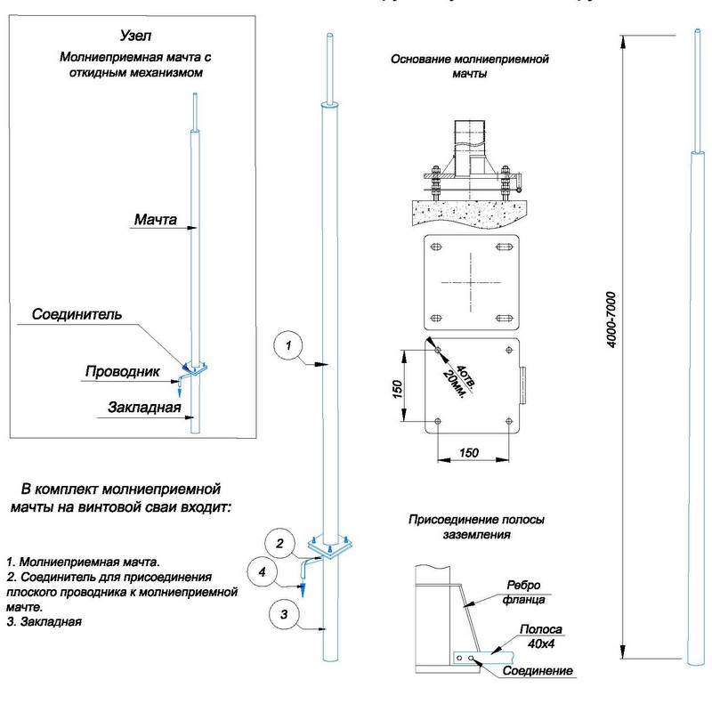 В комплект молниеприемной мачты входит: мачта, закладная для установки, соединитель мачты и проводника.