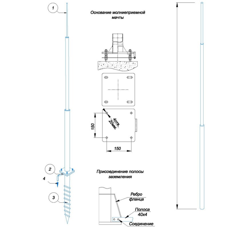 Молниеприемную мачту можно установить на грунт. Проводник крепится к мачте при помощи болтового соединителя или сварки.