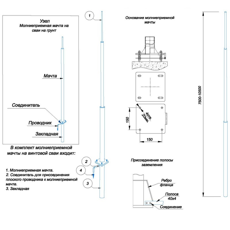 В комплект молниеприемной мачты входит: мачта, закладная для установки, соединитель мачты и проводника.