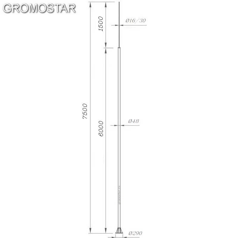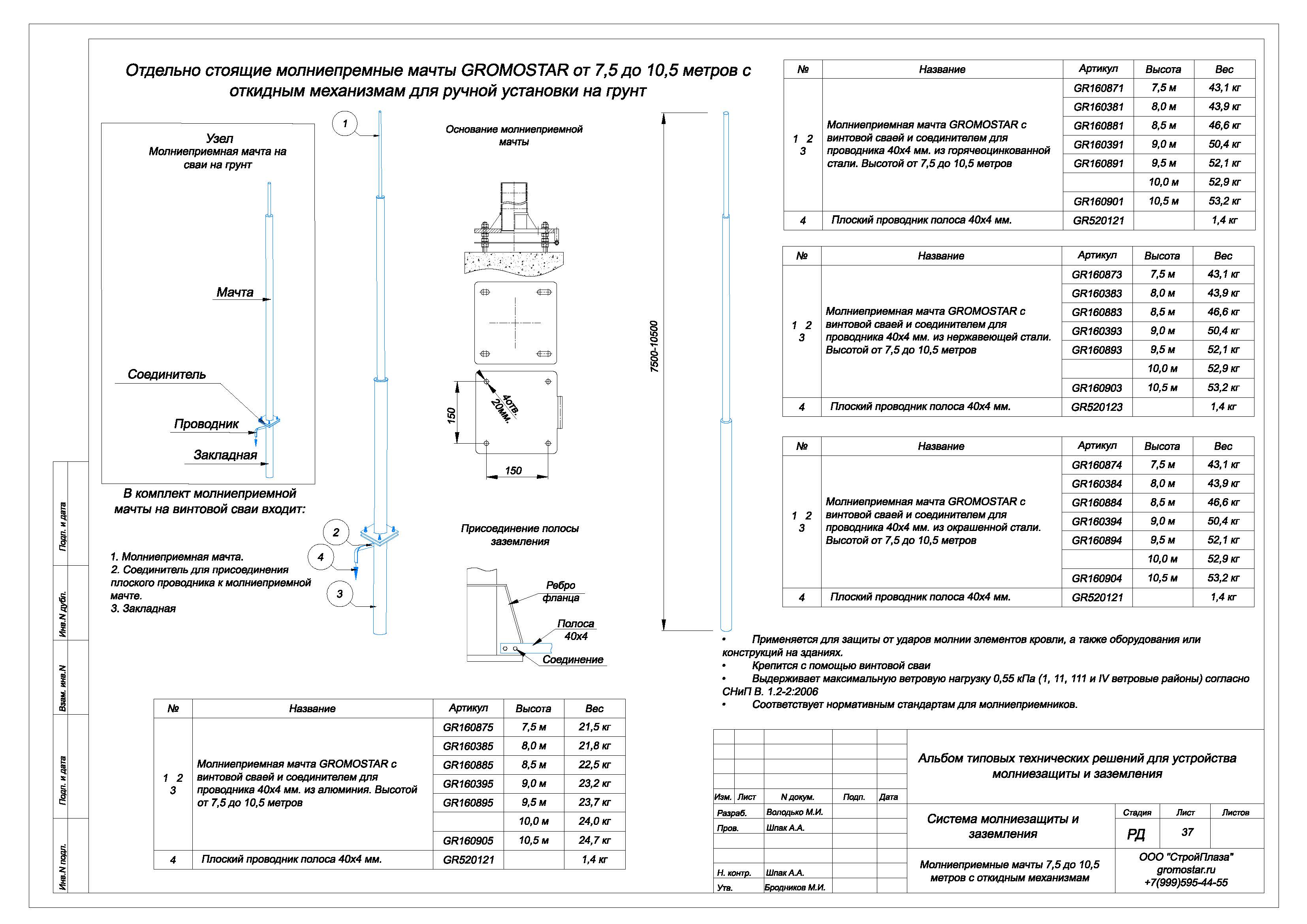 Отдельно стоящая молниеприемная мачта 7,5 метров GROMOSTAR с откидным механизмам для ручной установки имеет в составе: мачта, закладная, соединитель для присоединения мачты к проводнику. Молниеприемная мачта устанавливается на грунт.