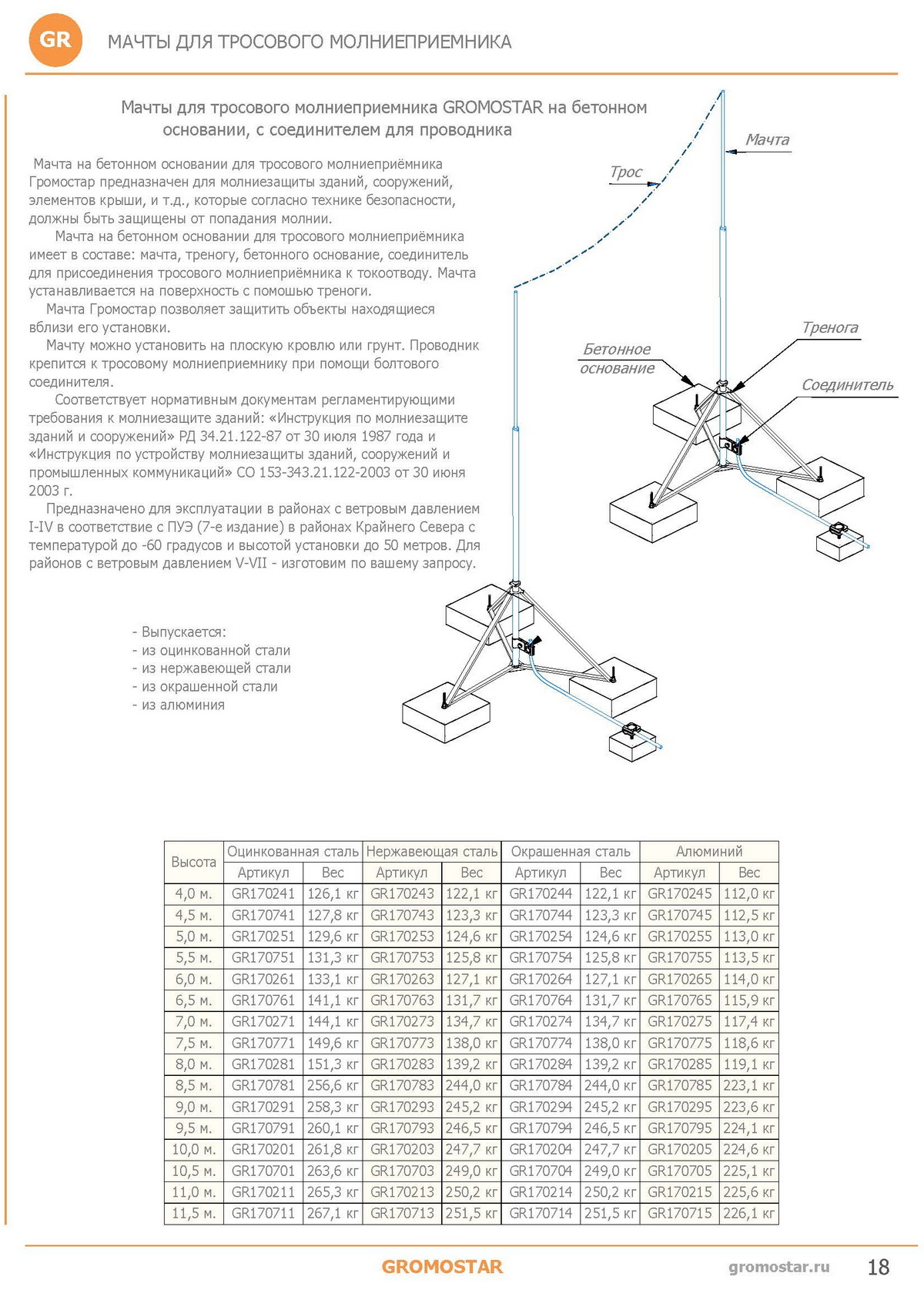 Мачта 5 метров для тросового молниеприёмника на треноге GROMOSTAR служит для защиты сооружений, зданий от прямого удара молнии. Предназначен для перехвата разряда молнии и отведение ее тока через подключенные к нему токоотводы.