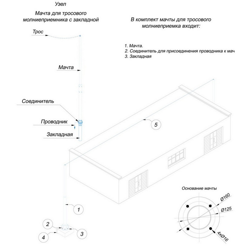 Мачта для тросового молниеприёмника имеет в составе: мачта, закладной деталью для бетонного основания, соединитель для присоединения тросового молниеприёмника к токоотводу. Мачта устанавливается на бетонный фундамент с закладной деталью и закрепляется анкерными болтами.