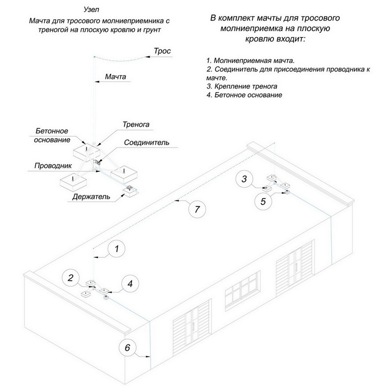 При помощи креплений мачту можно установить на плоскую кровлю или грунт. Проводник крепится к мачте при помощи болтового соединителя или сварки.