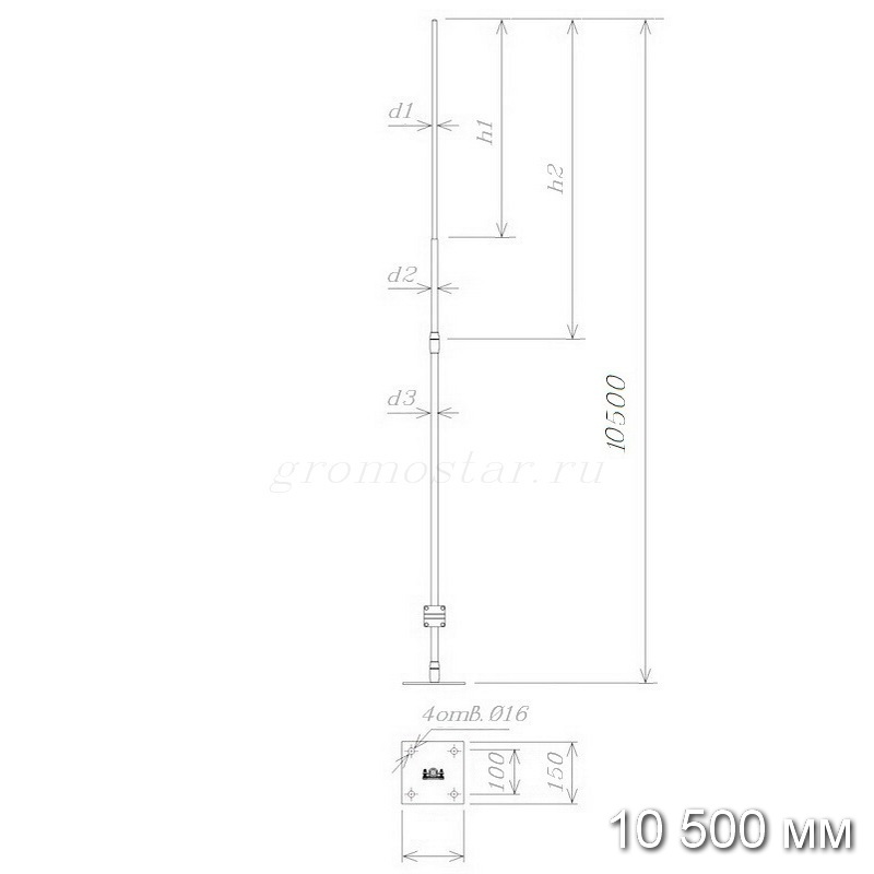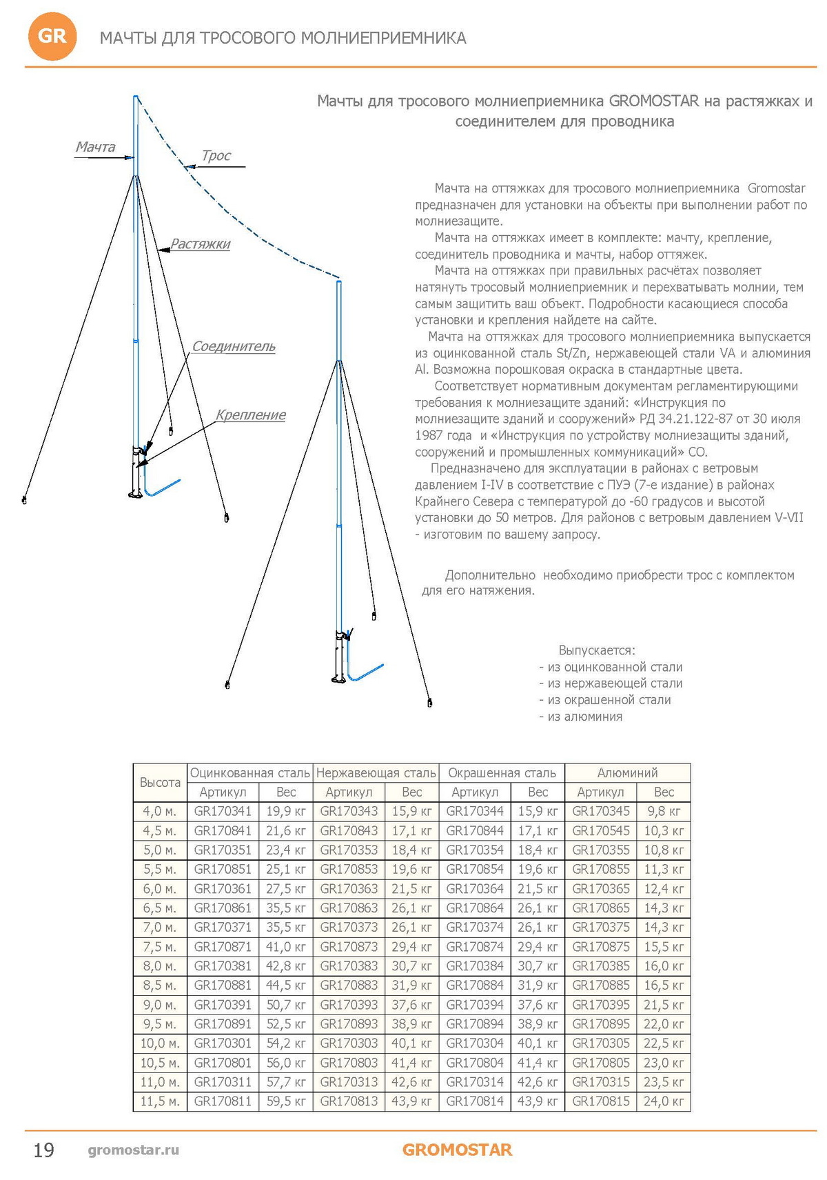 Мачта 10,5 метров для тросового молниеприёмника на растяжках GROMOSTAR служит для защиты сооружений, зданий от прямого удара молнии. Предназначен для перехвата разряда молнии и отведение ее тока через подключенные к нему токоотводы.