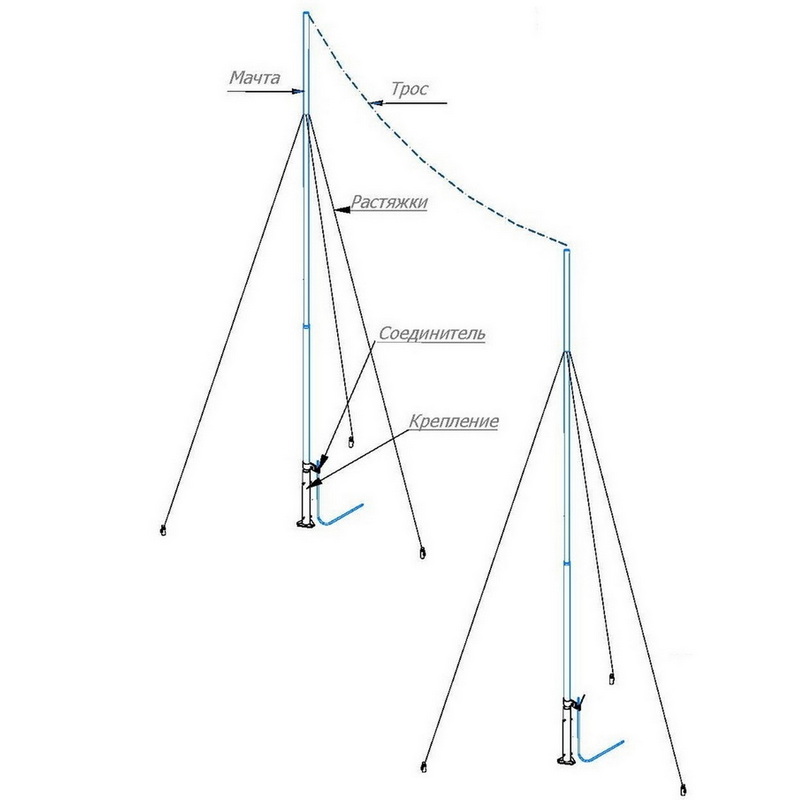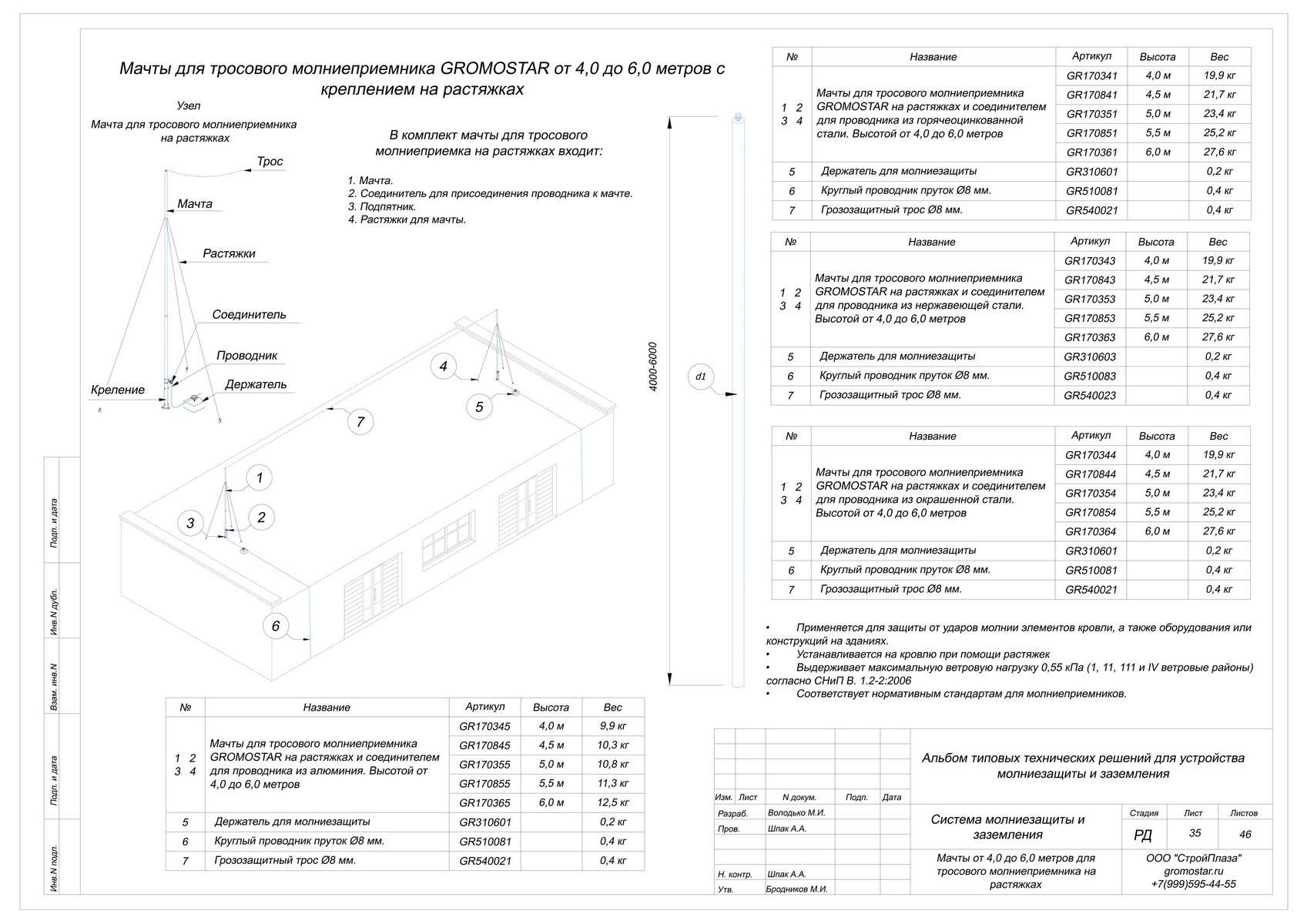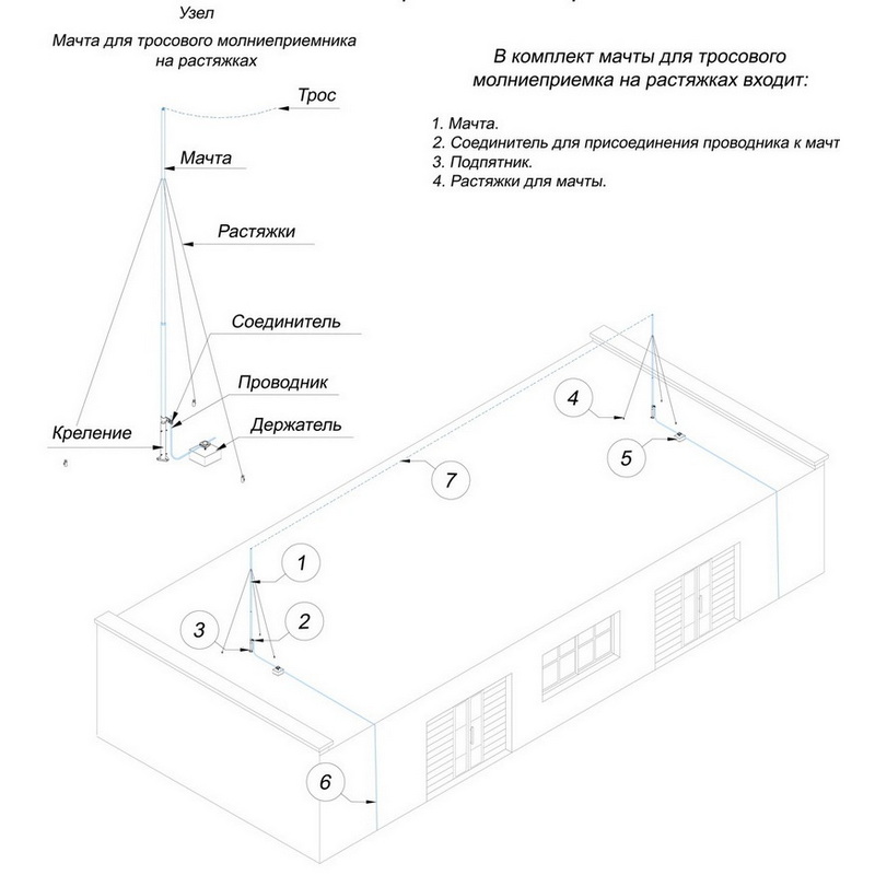 Мачта для тросового молниеприёмника имеет в составе: мачта, комплект растяжек, соединитель для присоединения к полосе. Мачта устанавливается на основание и закрепляется анкерными болтами.
