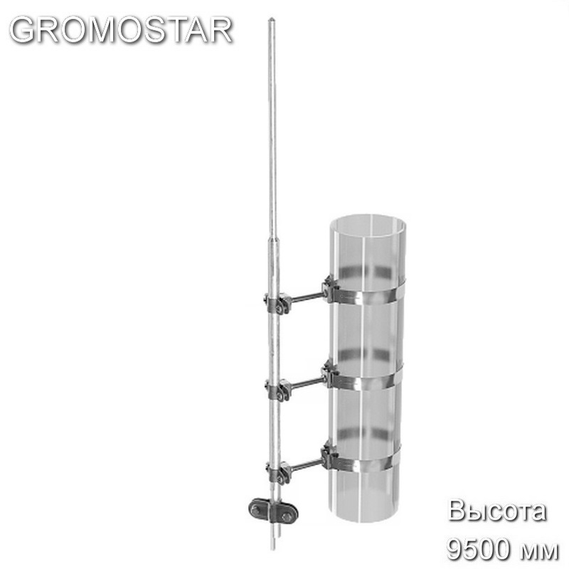 Молниеприёмная мачта высотой 9,5 метров с креплением на трубы из оцинкованной стали Громостар предназначен для молниезащиты зданий, сооружений, элементов крыши, и т.д., которые согласно технике безопасности, должны быть защищены от попадания молнии.
