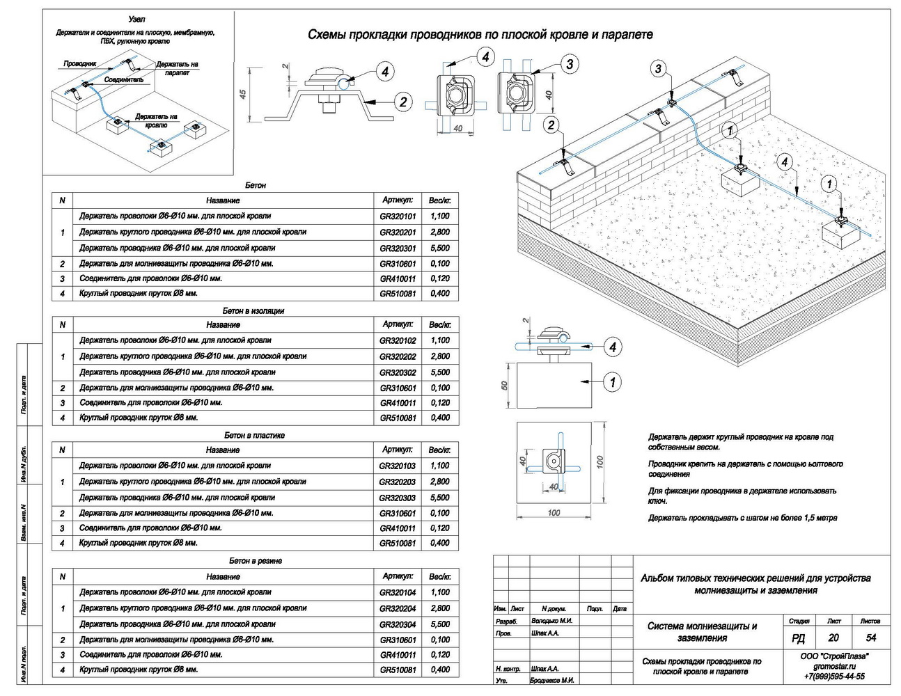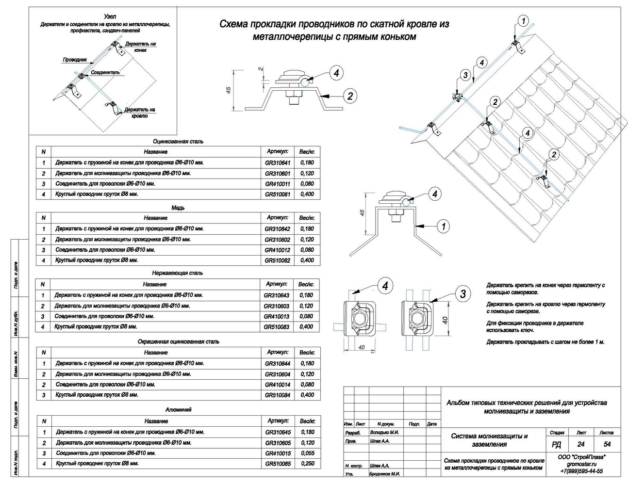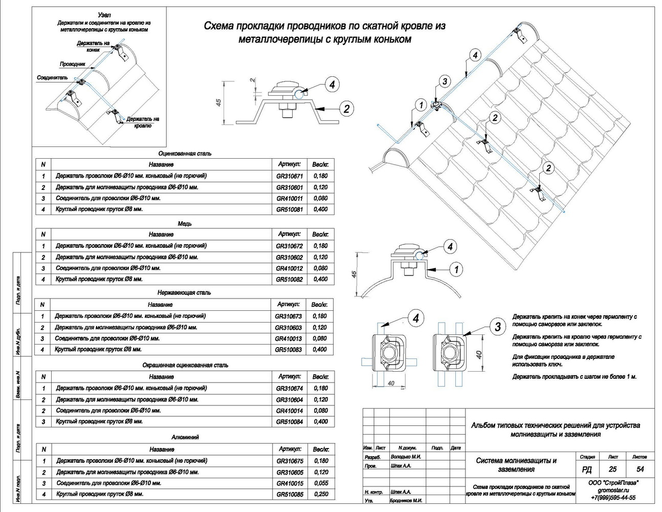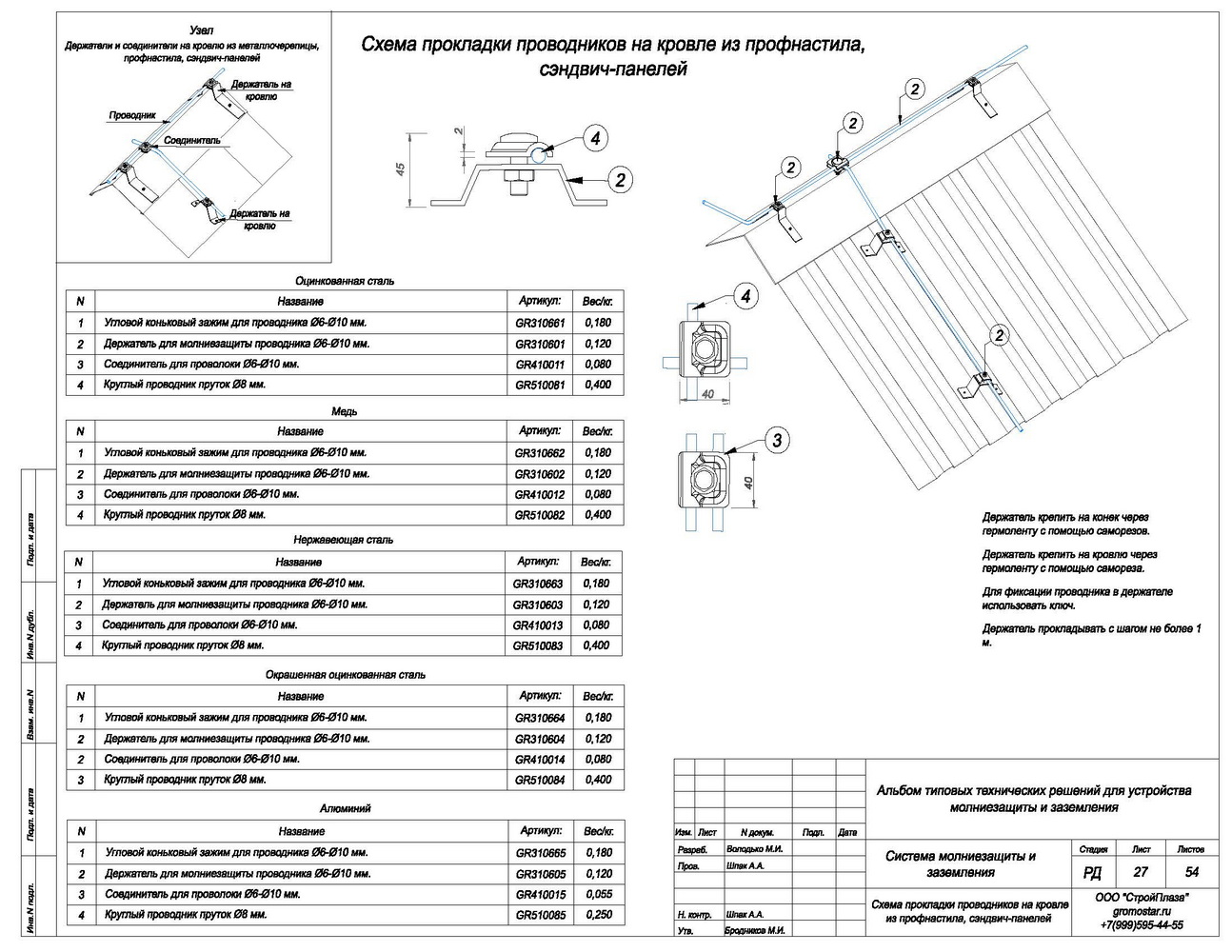 Внешний вид товара может отличаться от товара, представленного на фото. Фирма-производитель оставляет за собой право на внесение изменений в конструкцию, дизайн и Держатель представляет собой изделие для закрепления круглого проводника Ø6-Ø10 мм. на скатной кровле из профнастила, сэндвич-панелей, металлочерепицы, гибкой черепицы. На бетонном, вентилируемом и остеклённом фасаде здания. На парапете и коньке кровли.