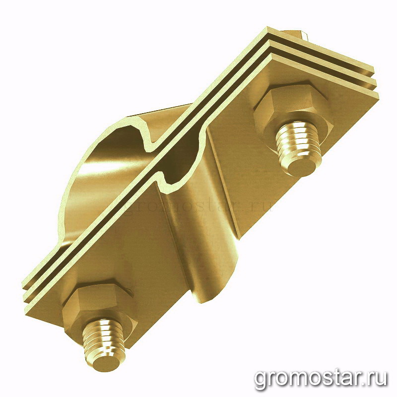 Соединитель стержня Ø14 мм., полосы 25-50 мм. и круга Ø8-Ø10 мм. для заземления Gromostar, предназначен для соединения стержня заземления, полосы и круглого проводника при устройстве молниезащиты и заземления.