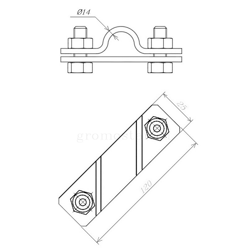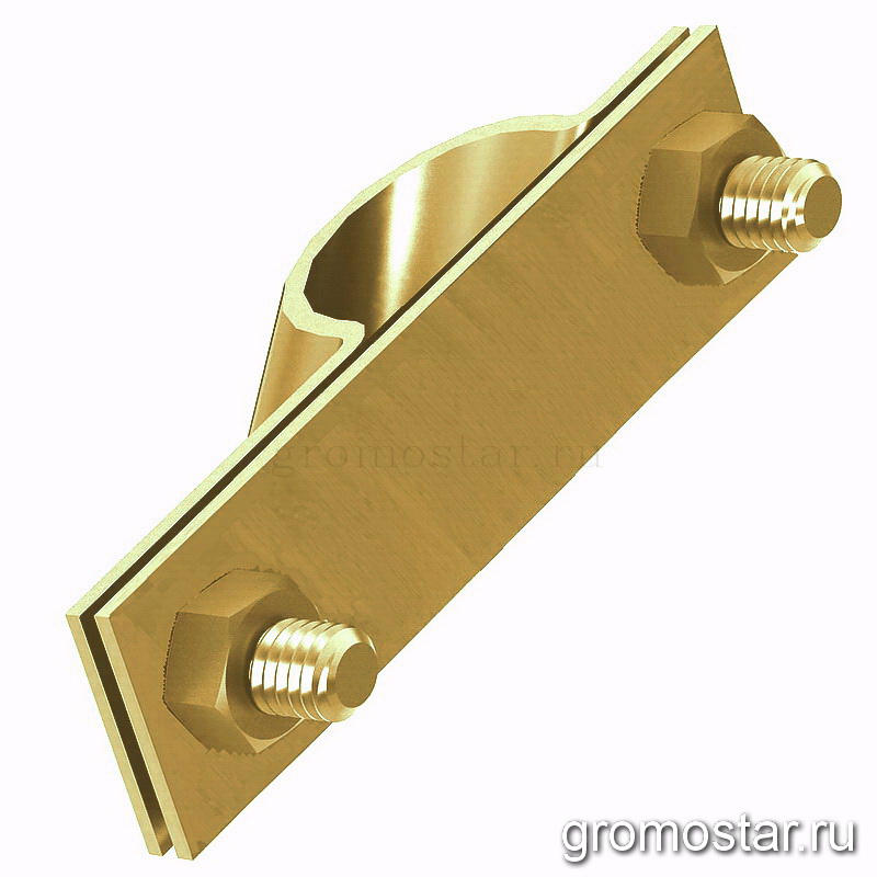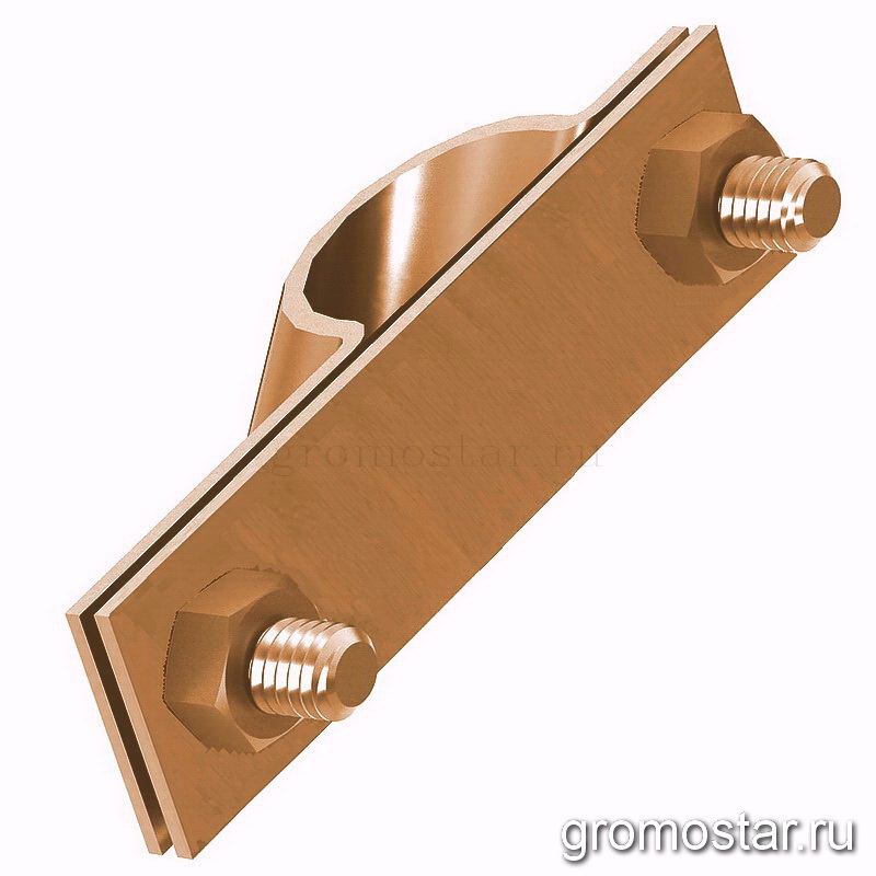 Соединитель стержня Ø14 мм. и полосы 25-50 мм. для заземления Gromostar, предназначен для соединения стержня заземления, полосы и круглого проводника при устройстве молниезащиты и заземления.