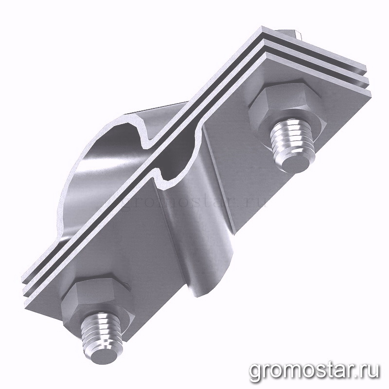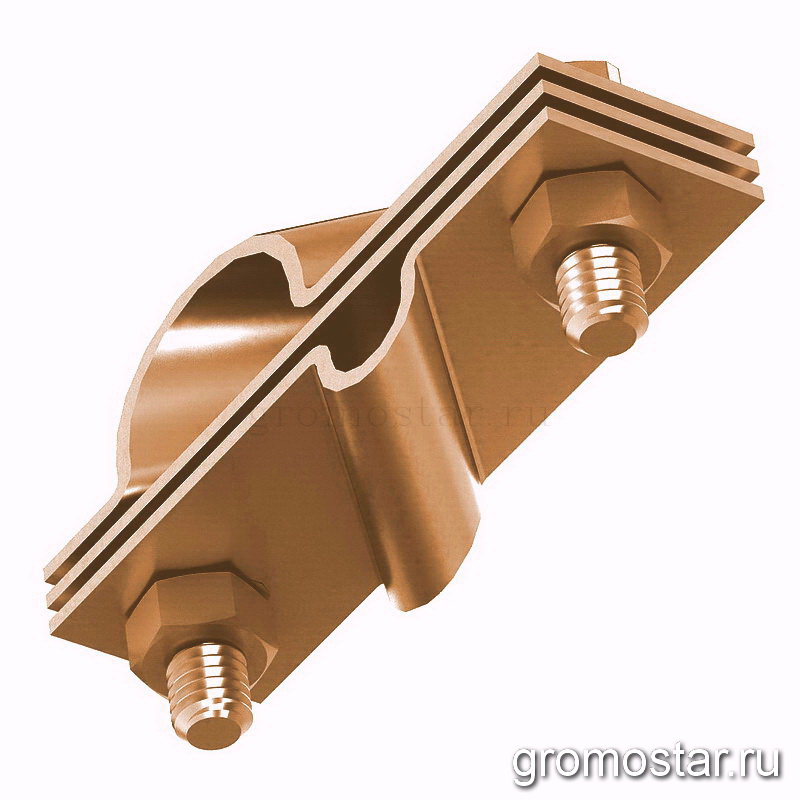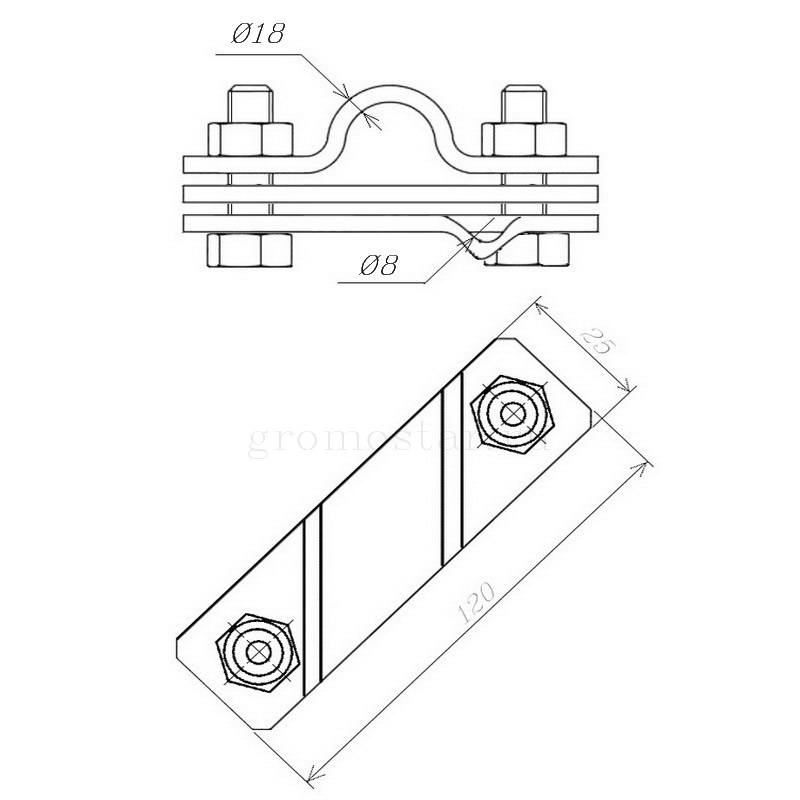 Соединитель заземления для стержня Ø18 мм., полосы 50 мм. и круга Ø8 мм., размером 125х25 мм. Gromostar, предназначен для соединения стержня заземления, полосы и круглого проводника при устройстве молниезащиты и заземления.