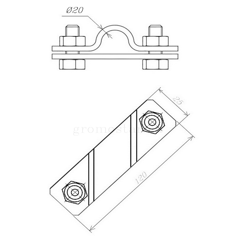 Соединитель заземления для стержня Ø20 мм. и полосы до 50 мм. Gromostar, предназначен для соединения стержня заземления, полосы и круглого проводника при устройстве молниезащиты и заземления.
