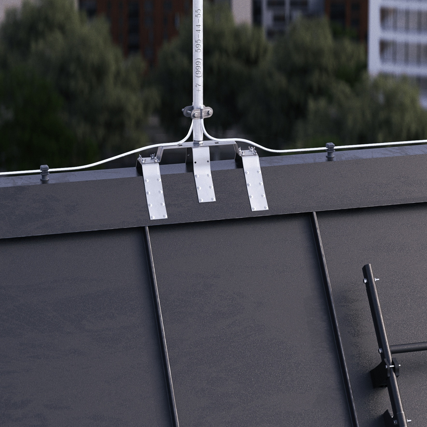 Молниеприёмник можно установить на коньке кровли. Проводник крепится к молниеприёмнику при помощи болтового соединителя.