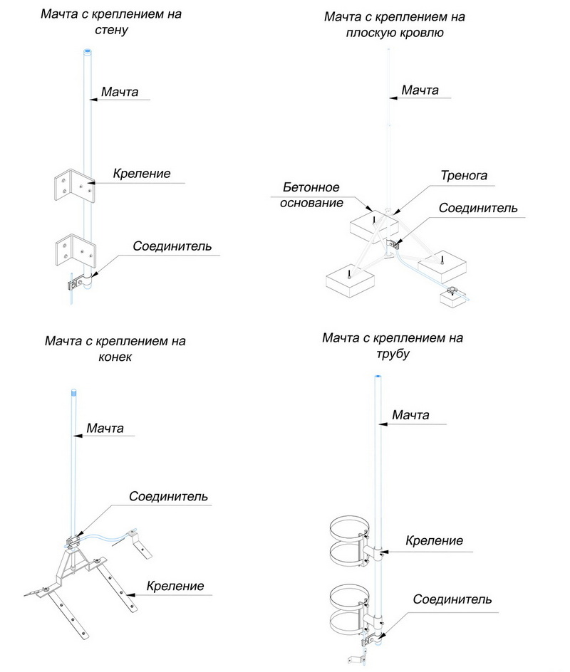 При помощи различных креплений мачту молниеприёмную можно установить на стене, трубе, плоской кровле, дымоходе, коньке и грунте. Проводник крепится к мачте молниеприёмной при помощи болтового соединителя.
