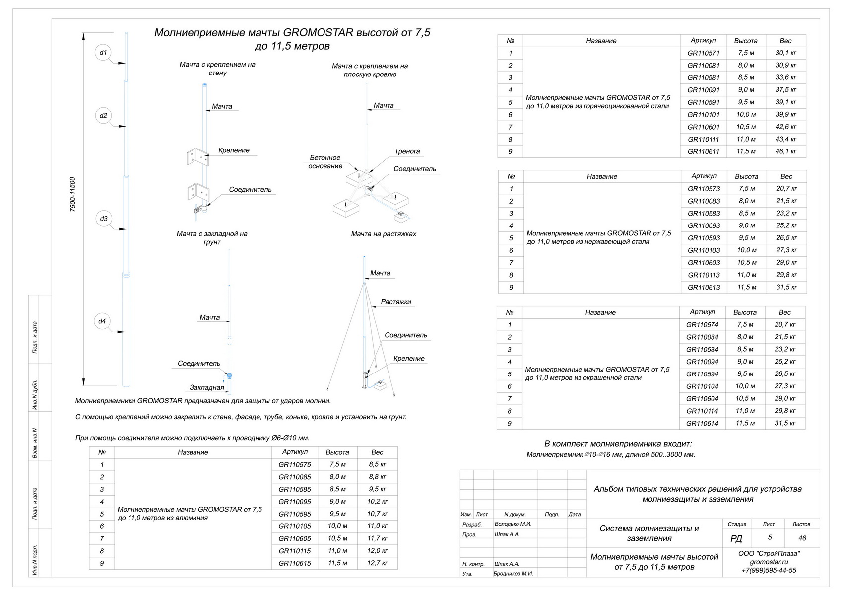 Подробности касающиеся способа установки и крепления найдете на сайте. Молниеприёмная мачта облегчённая выпускается из горячеоцинкованной сталь St/Zn, нержавеющей стали VA и алюминия Al.