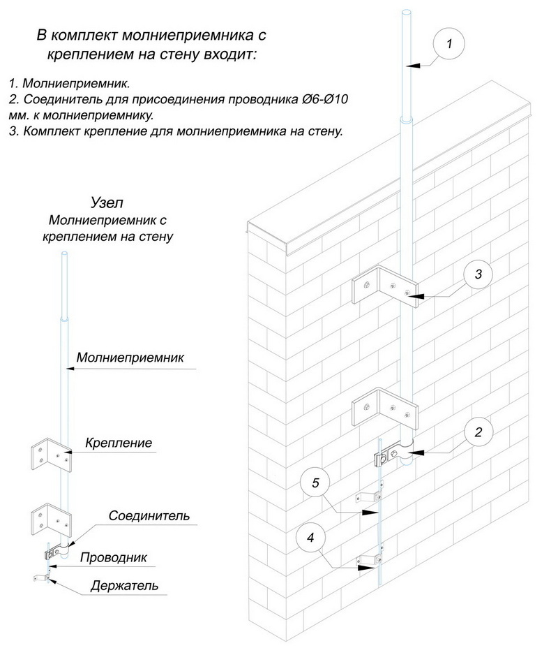В комплект молниеприёмника входит: стержневой молниеприёмник, комплект для установки молниеприёмника на стену, соединитель молниеприёмника и круглого проводника Ø6-Ø12 мм.