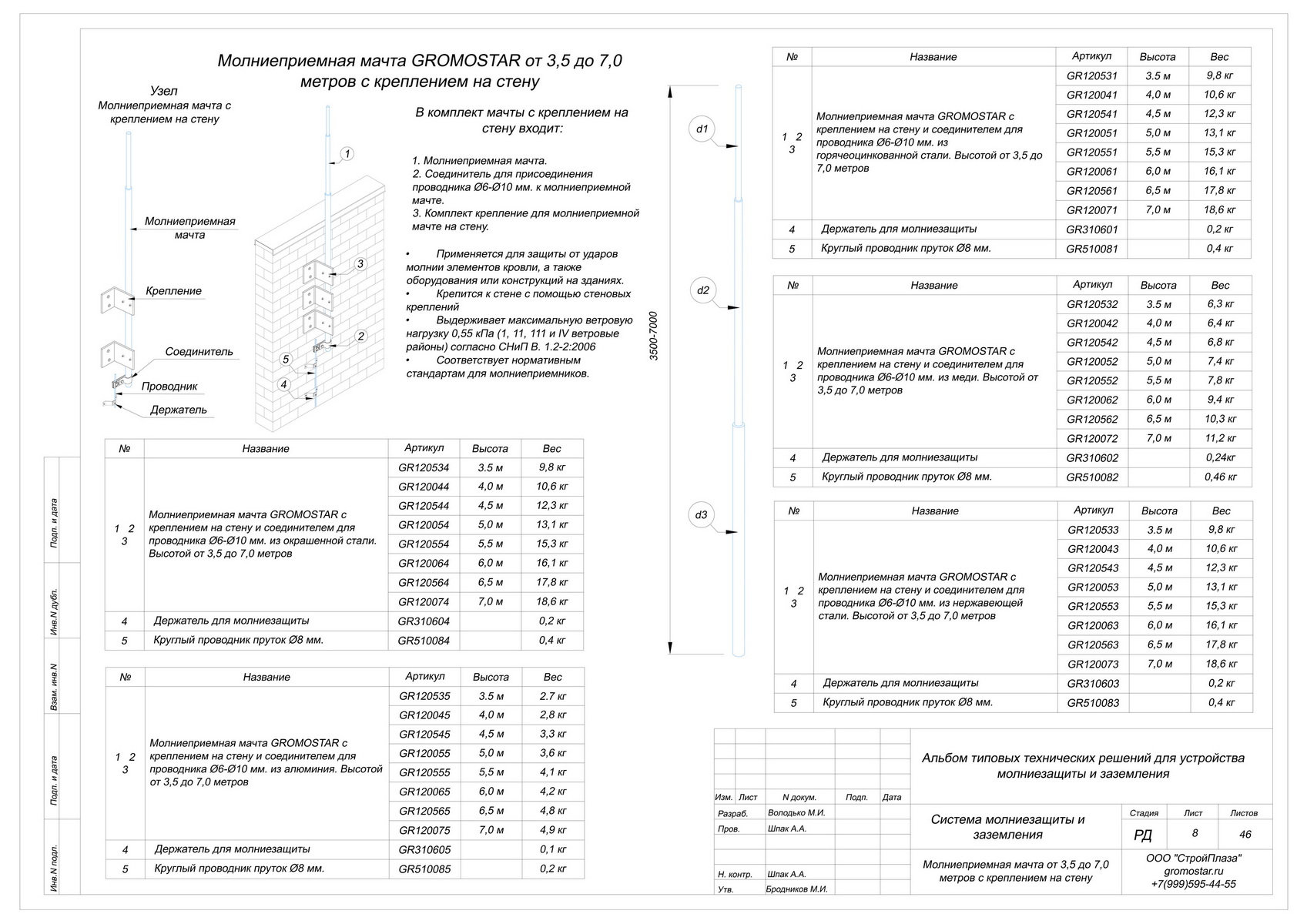 Предназначено для эксплуатации в районах с ветровым давлением I-III в соответствие с ПУЭ (7-е издание) в районах Крайнего Севера с температурой до -60 градусов и высотой установки до 50 метров. Для районов с ветровым давлением IV-VII - изготовим по вашему запросу.