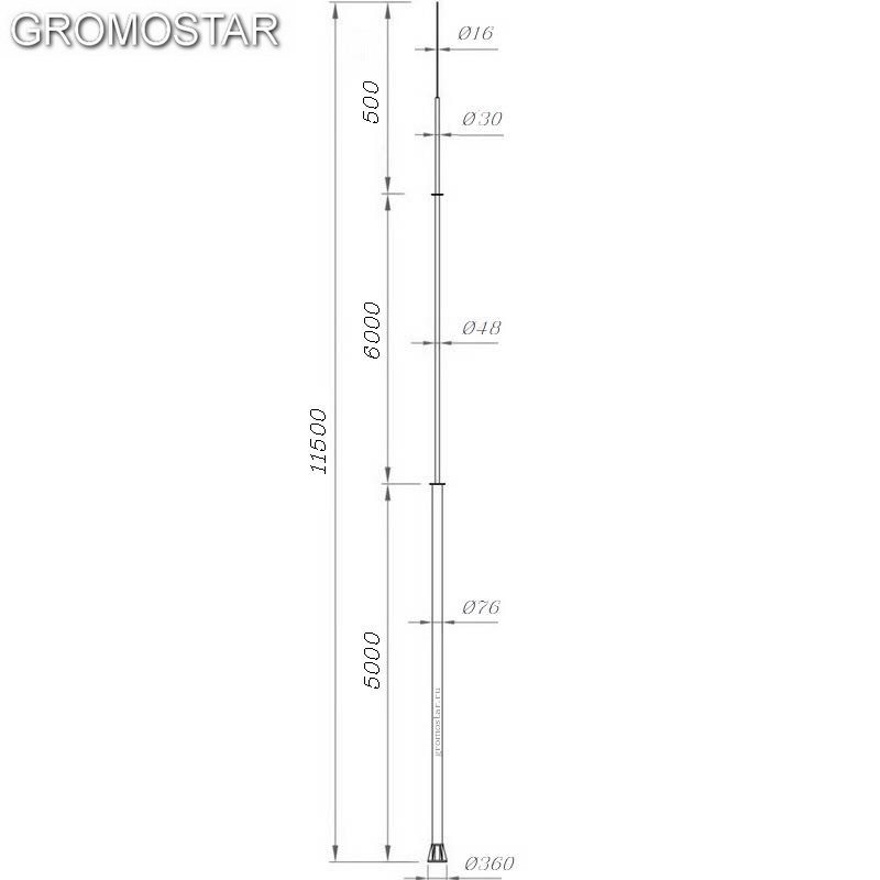 Отдельно стоящая молниеприемная мачта 11,5 метров GROMOSTAR на свае с откидным креплением для ручной установки предназначен для молниезащиты зданий, сооружений, элементов крыши, и т.д., которые согласно технике безопасности, должны быть защищены от попадания молнии.