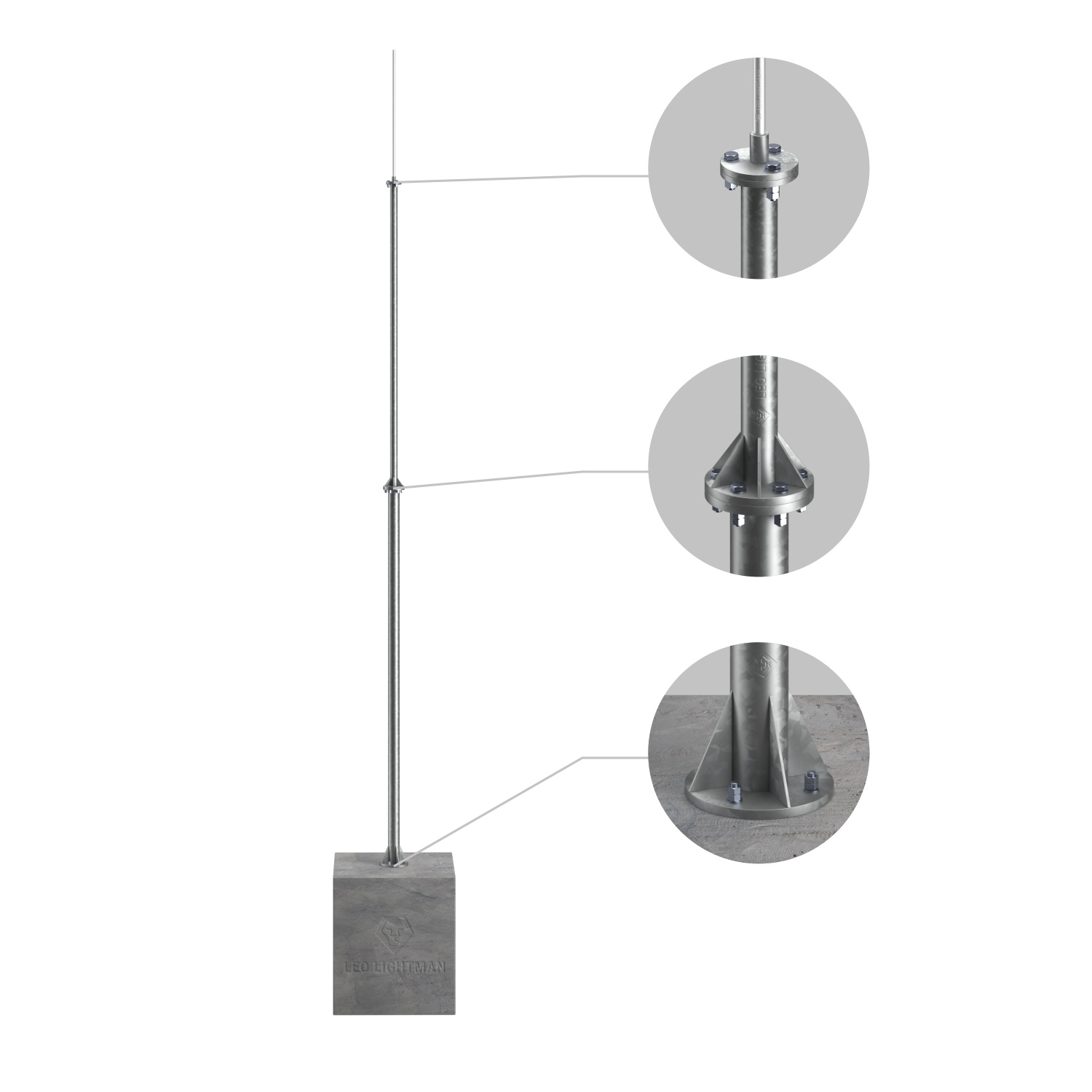Подробности касающиеся способа установки и крепления найдете на сайте. Мачта молниеприемная секционная пассивная алюминиевая выпускается из горячеоцинкованной сталь St/Zn, нержавеющей стали VA и алюминия Al.